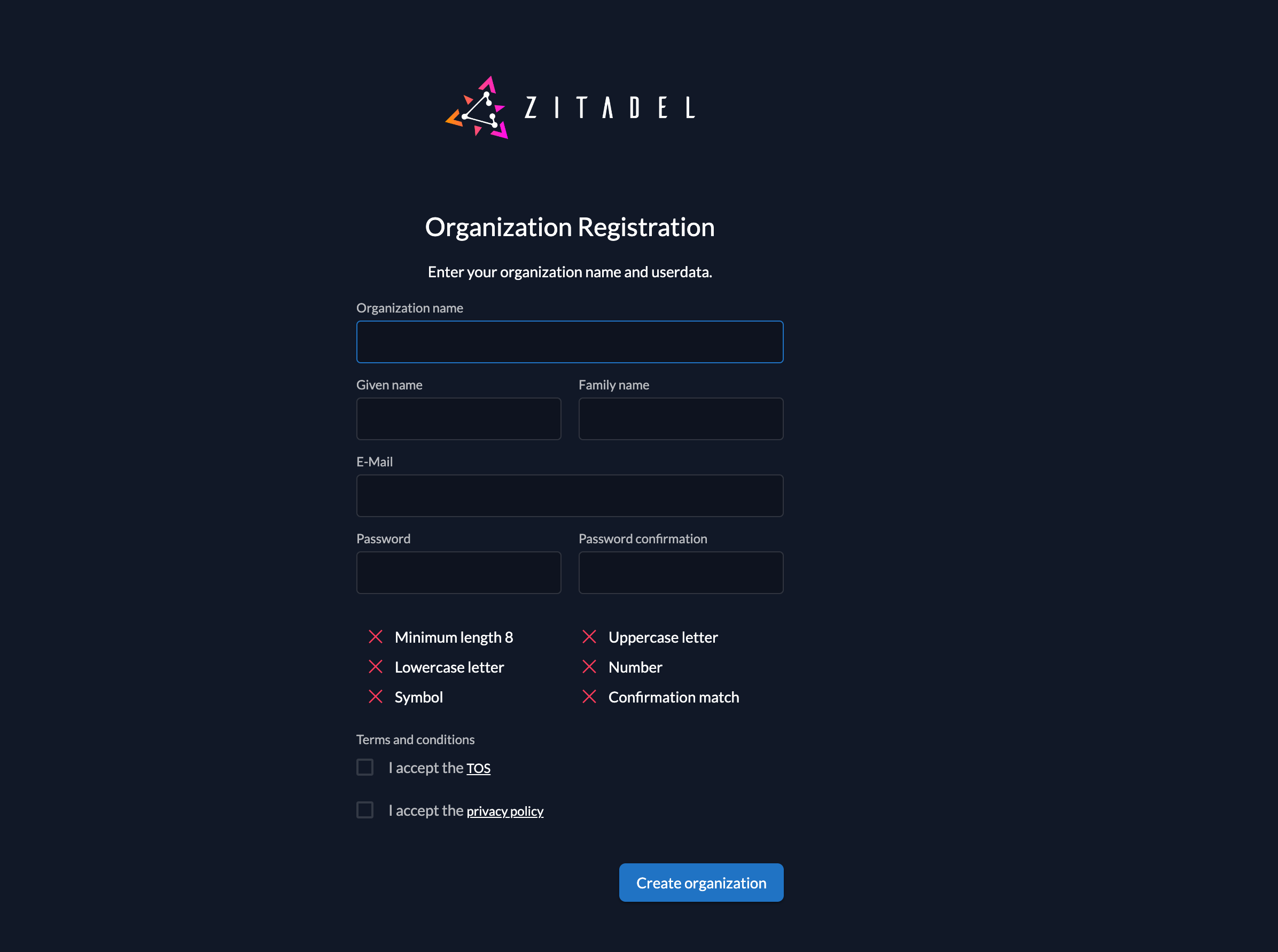 A basic form that allows a customer to enter an organization name and a user account is hosted on the following URL: {custom-domain}/ui/login/register/org