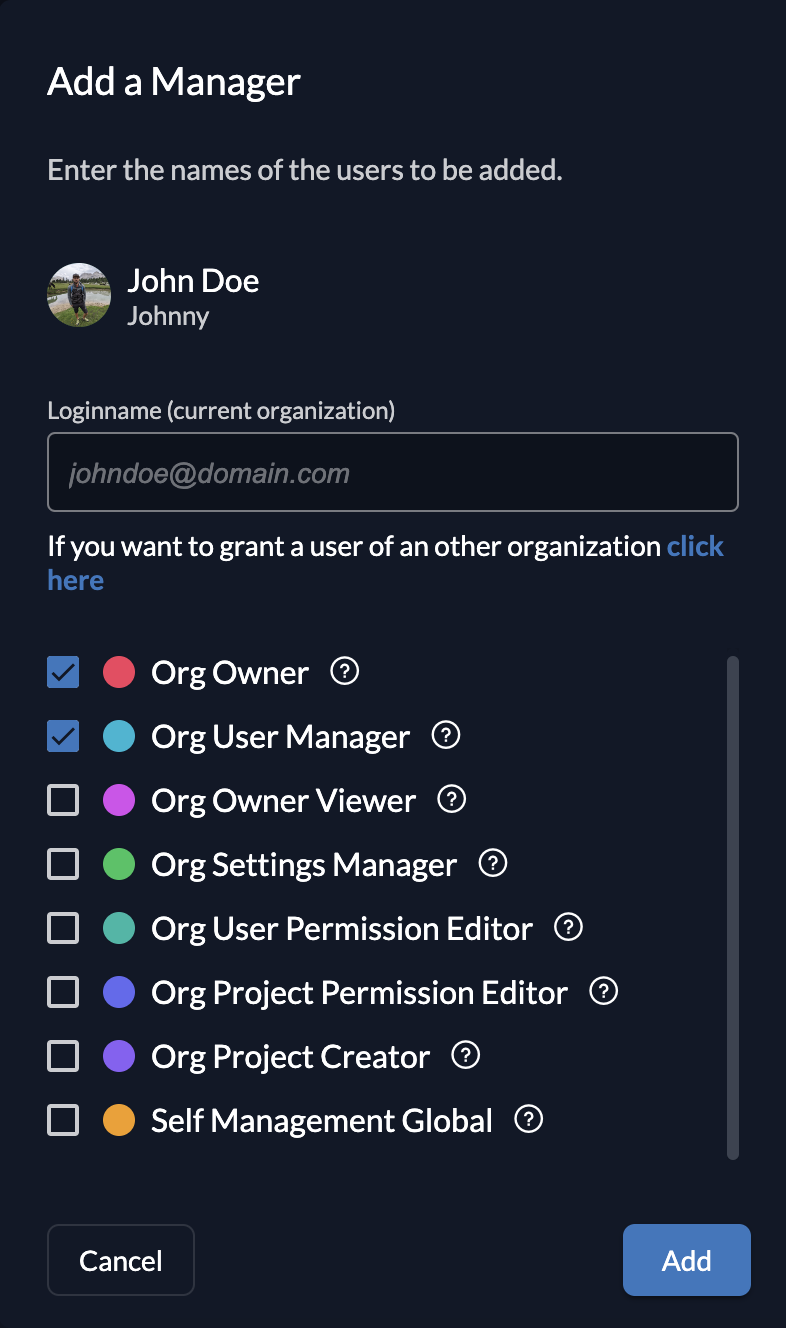Manager permissions can be assigned to different levels in ZITADEL: